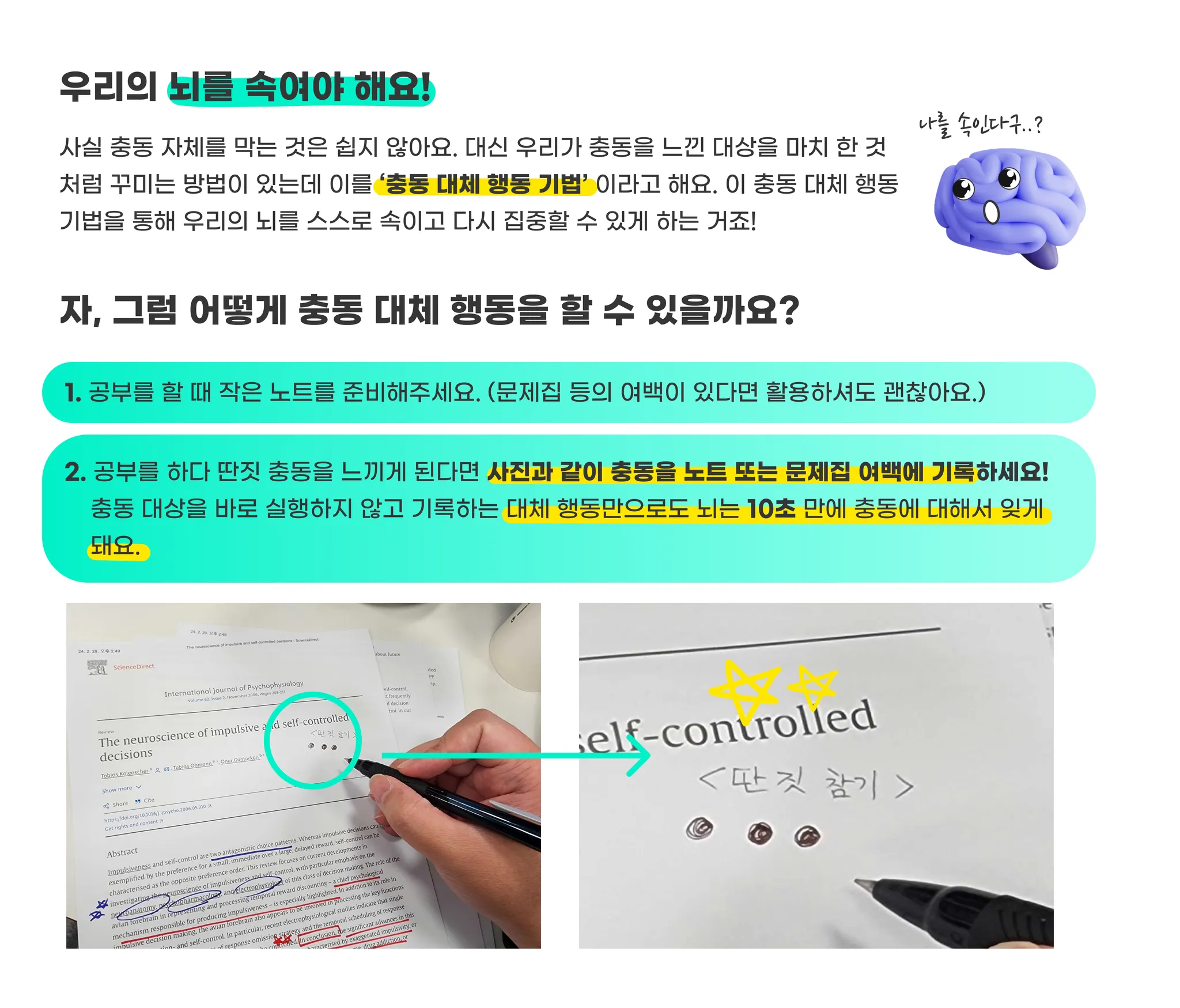 자 그럼 지금부터 어떻게 이런 딴짓 충동을 제어하고 몰입할 수 있는지 비법을 알려드릴게요.