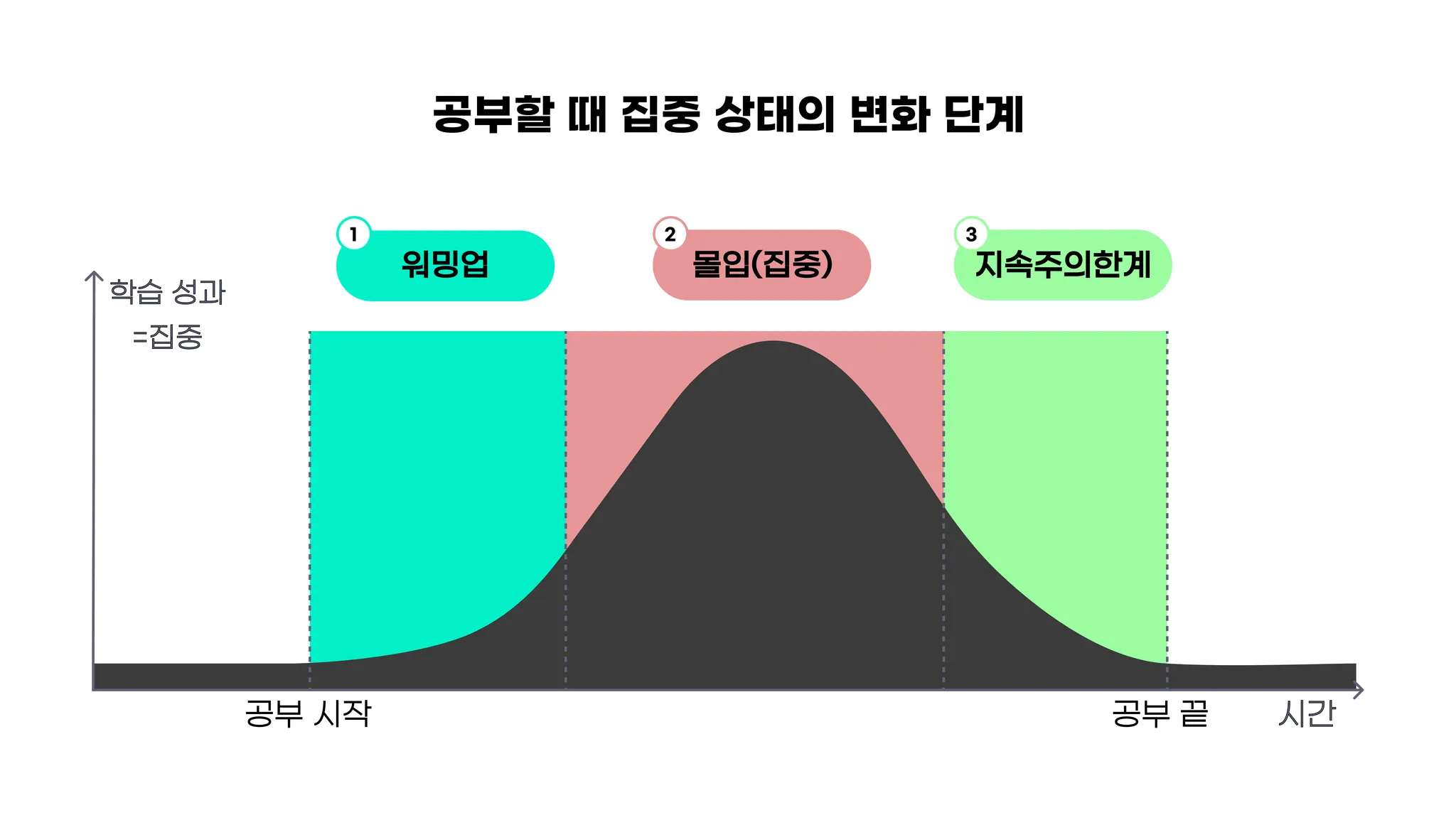 자, 집중력 강화 비법을 이해하기 위해선 먼저 우리가 공부하는 동안 집중력 상태가 어떻게 변화하는 지를 짚고 넘어가야 해요. 뇌과학적으로 집중의 상태는 다음과 같은 흐름을 가지고 있어요.